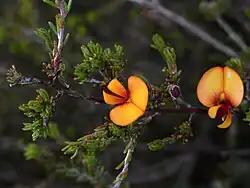 Pultenaea prostrata, commonly known as silky bush-pea,[2] is a species of flowering plant in the family Fabaceae and is endemic to south-eastern Australia. It is a small, rigid, wiry, low-lying or prostrate shrub with cylindrical leaves, and yellow, red and purple-brown flowers.