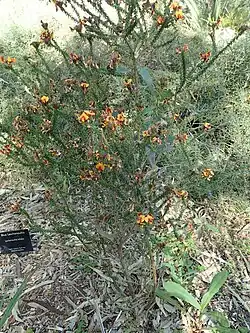 Pultenaea skinneri, commonly known as Skinner's pea,[2] is a species of flowering plant in the family Fabaceae and is endemic to the south-west of Western Australia. It is a slender shrub with simple leaves, and yellow, red and orange flowers with red markings.
