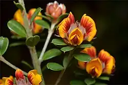 Pultenaea stricta, commonly known as rigid bush-pea,[2] is a species of flowering plant in the family Fabaceae and is endemic to south-eastern continental Australia. It is a slender, erect or low-lying shrub with elliptic to egg-shaped leaves with the narrower end towards the base, and yellow and red, pea-like flowers.