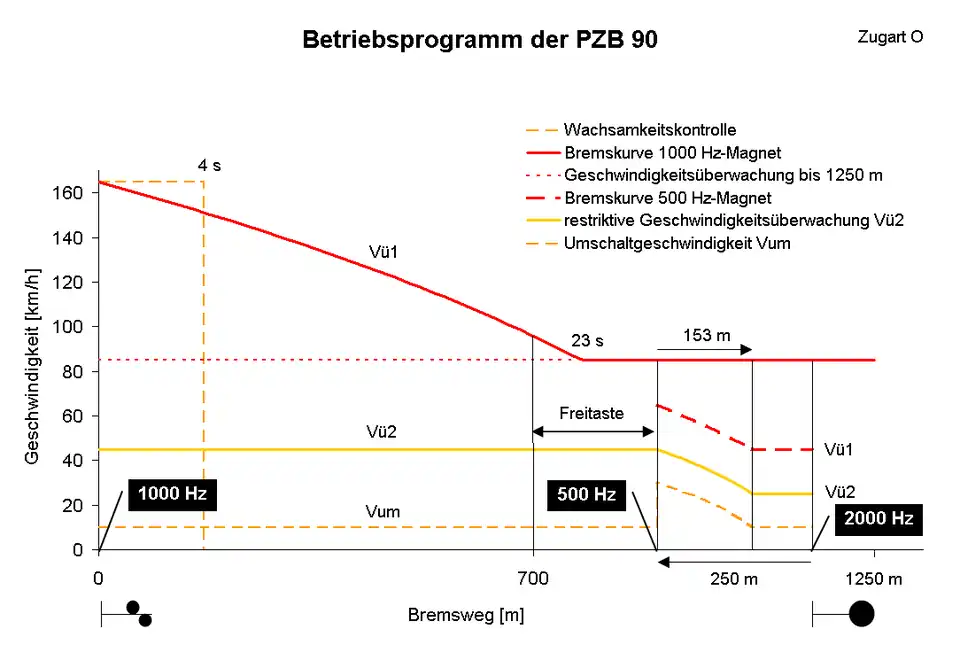 The details of operation have changed over time and the later PZB systems allow more granular speed restrictions. The basic part of the operation scheme (German "Betriebsprogramm") of the PZB90 protocol does still use the three inductor types as seen in the following picture. The diagram shows the speed (German "Geschwindigkeit" in km/h) in accordance with the braking distance (German "Bremsweg" in meter) before and after a main signal (placed at the 2000 Hz point).