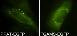 Purine biosynthesis enzymes cluster into discrete intracellular bodies when transiently expressed as fusions to enhanced green fluorescent protein (EGFP) in HeLa cells.[13] FGAMS is an alternate name for PFAS.