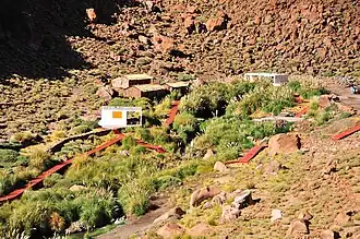 The hot springs are managed by now, since 2011, the Explora hotel, charging for $35,000 Chilean pesos to get in (Spanish: Consejo de pueblos Atacameños) who are responsible for maintaining the modern tourist facilities. Facilities include the outdoor pools connected by wooden footpaths, some waterfalls, and changing rooms.[5][6] The town of San Pedro de Atacama was declared a “traditional zone” (Spanish: "Zona típica") in 1980.[7] In 2007, the springs were the subject of a legal controversy between the hotel and the Atacameno community, with the latter charging that the hotel was taking over the springs.[8]