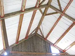 Common purlins in wood construction, also called a "major-rafter minor-purlin system".[3] Common purlins are typically "trenched through" the top sides (backs) of principal rafters and carry vertical roof sheathing (the key to identifying this type of roof system). Common purlin roofs in North America are found in areas settled by the English and may have been a new invention in the Massachusetts Bay Colony. No examples of framed buildings with common purlin roofs have been reported in England, however some stone barns in England have vertically boarded, common purlin roofs. Historically, these roofs are found in New England, the highest concentration in Maine, and isolated parts of New York and along the St. Lawrence River in Canada. One of the oldest surviving examples is in the Coffin House in Newbury, Massachusetts, from 1678. The purpose of a common purlin roof may be they allow a board roof, that is a roof of nothing but vertically laid boards with seams covered with battens or another layer of boards.[4]