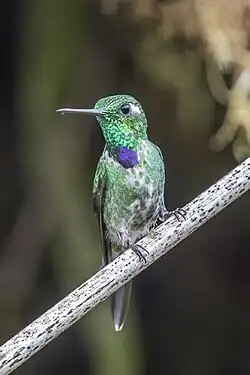 The purple-bibbed whitetip (Urosticte benjamini) is a species of hummingbird in the "brilliants", tribe Heliantheini in subfamily Lesbiinae. It is found in Colombia and Ecuador.[3][4]