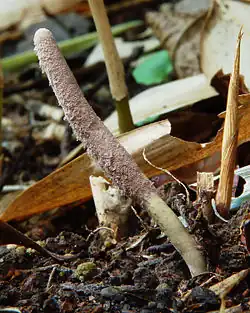 Purpureocillium is a fungal genus in the Ophiocordycipitaceae family. The genus now contains at least 5 species with the type species Purpureocillium lilacinum, a common soil mold.[3] It has been isolated from a wide range of habitats, including cultivated and uncultivated soils, forests, grassland, deserts, estuarine sediments and sewage sludge, and insects. It has also been found in nematode eggs, and occasionally from females of root-knot and cyst nematodes. In addition, it has frequently been detected in the rhizosphere of many crops. The species can grow at a wide range of temperatures – from 8 to 38 °C (46 to 100 °F) for a few isolates, with optimal growth in the range 26 to 30 °C (79 to 86 °F). It also has a wide pH tolerance and can grow on a variety of substrates.[4][5] P. lilacinum has shown promising results for use as a biocontrol agent to control the growth of destructive root-knot nematodes.