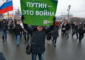 Putin. War (Russian: Путин. Война) is a report based on materials prepared by the Russian opposition politician Boris Nemtsov about the 2014–present Russian military intervention in Ukraine. Published on the website Putin. Itogi on 12 May 2015, it covers the preparations for the annexation of Crimea by the Russian Federation and the involvement of Russian troops in the war in Donbas. The report includes testimonials of Russian soldiers taken prisoner in Ukraine and photos of Russian military personnel who died in the hostilities.[1][2][3]
