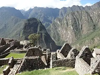 Putucusi (center-left) behind the ruins of Machu Picchu