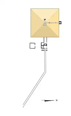 The pyramid was 52.5 metres (172 ft 3 in) in height, 78.75 metres (258 ft 4 in) in base length with an inclination of 53°07'48".[3] The causeway is 250 metres (820 ft) long and the complex was surrounded by a wall of mud brick.[5]