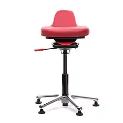 The chairs are designed around a feature Osler patented as RedRocker technology;[1] a dome-shaped rubber piece beneath the seat that allows it to wobble and pivot.[2] Each model of chair resembles a stool.[1][7] The chair’s design requires the sitter to keep both feet on the ground and places the knees below the hips.[1] The chair can rock in all directions.[8]