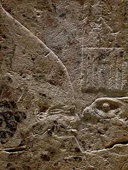 Further arguments of Pätznik and Vandier concern the inscriptions right of Qahedjet's serekh. The hieroglyphic signs are unusually shifted to the right and they are not square in arrangement. This contradicts the Egyptian rules of calligraphy on royal monuments. Additionally, the details on the owl-sign (value m) of the stele do not appear before the first half of the 18th Dynasty and the stele would represent the earliest formulation Horus + m + toponym. Finally, serekh names involving a royal crown as a hieroglyphic symbol are otherwise only known from king Thutmose III of the 18th Dynasty onwards, and Pätznik and Vandier remark that Qahedjet is known to be a variant of Thutmose III's Horus name, so that the stele, if authentic, could be an archaistic work of the New Kingdom.[1]