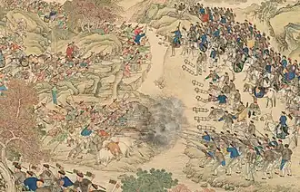 A battle between Qing troops and Uyghur Khojas near Lake Eshilkul in 1759.