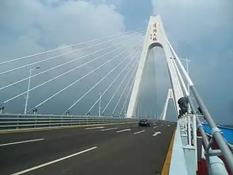 It is 1,828 metres (5,997 ft) long and 34 metres (112 ft) wide. This cable-stayed bridge has two A-shaped towers that are 105.81 meters high. It has 6 lanes for automobile traffic and a 2-metre side lane at the edges for small vehicles and pedestrians. The speed limit is 80 km/h.[2]