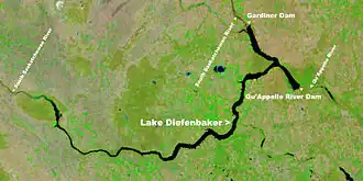 The Qu'appelle River Dam[1] is the smaller of two embankment dams along the South Saskatchewan River that created Lake Diefenbaker in the Canadian province of Saskatchewan. The bigger of the two dams is Gardiner Dam, which is the largest embankment dam in Canada and one of the largest in the world. Construction of both dams began in 1959 and was completed in 1967.[2][3] Lake Diefenbaker is the largest lake in southern Saskatchewan.[4]