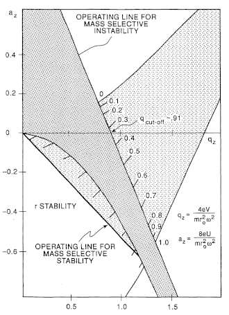 The trapping of ions can be understood in terms of stability regions in and space. The boundaries of the shaded regions in the figure are the boundaries of stability in the two directions (also known as boundaries of bands). The domain of overlap of the two regions is the trapping domain. For calculation of these boundaries and similar diagrams as above see Müller-Kirsten.[9]