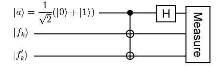 This is done with the following quantum circuit which uses one Fredkin gate F, one Hadamard gate H and an ancilla qubit a. First of all the ancilla qubit is set to a symmetric state .