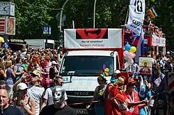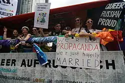 In February 2012, Quarteera once again was one of the organizers of the protests in front of the Russian Embassy in Berlin against a ban on the promotion of homosexuality in St. Petersburg. The protest was supported by activists from the Russian "Rainbow Association", the International Film Festival "Side by Side", the International Hirschfeld Eddy Foundation and the Union of Gays and Lesbians in Germany.[3][9][10][11] The rally was also attended by German politicians, such as member of the Bundestag, Marieluise Beck.[3]