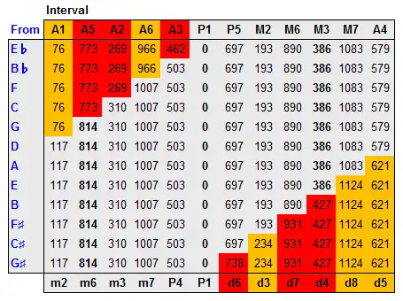 The table shows the approximate size of the notes in cents: The genuine notes are on a light grey background, the out-of-tune substitutes are on a red or orange background; the name for the genuine intervals are at the top or bottom of a column with plain grey background; the interval names of the bad substitutions are at opposite end, printed on a colored background. Interval names are given in their standard shortened form.[a] For instance, the size of the interval from D to A, which is a perfect fifth (P5), can be found in the seventh column of the row labeled D. strictly just (or pure) intervals are shown in bold font. Wolf intervals are highlighted in red.[b]