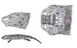 Quasicaecilia is an extinct genus of microsaur. It is known from the Early Permian of Texas in the United States. A single specimen is known, collected from the Texas Permian redbeds by Charles Hazelius Sternberg in 1917. It was originally identified as a specimen of the gymnarthrid microsaur Cardiocephalus. The skull is small, less than 2 centimetres (0.79 in) in length, and the otic capsule (a hollow region of bone encapsulating the inner ear) is very large in comparison to the rest of the skull. The skull of Quasicaecilia superficially resembles those of extant but unrelated caecilians, hence the genus name.[1] Quasicaecilia was assigned to the new family Brachystelechidae in 1991 along with the genera Batropetes and Carrolla.[2]