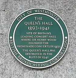- ^ The Queen's Hall had contained few memorials. In 1922 a bust by Malvina Hoffman of the tenor Gervase Elwes was placed in a special alcove at the back of the grand circle. In 1935 a memorial tablet to the pianist Fanny Davies was unveiled near the Elwes bust. Another memorial tablet was placed in memory of Robert Newman. These were all destroyed in the bombing. The bust of Wood that survived the destruction of the hall was by Donald Gilbert, unveiled in 1938 by Sir Walford Davies as part of the celebration of Wood's fifty years as a conductor. Its site was at the back of the Promenade floor. It is now on display at the Royal Academy of Music, except during Proms seasons, when it occupies a central position overlooking the orchestra at the Royal Albert Hall.[87]