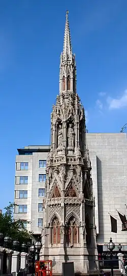 The Queen Eleanor Memorial Cross is a memorial to Eleanor of Castile erected in the forecourt of Charing Cross railway station, London, in 1864–1865. It is a fanciful reconstruction of the medieval Eleanor cross at Charing, one of twelve memorial crosses erected by Edward I of England in memory of his first wife. The Victorian monument was designed by Edward Middleton Barry, also the architect of the railway station, and includes multiple statues of Queen Eleanor by the sculptor Thomas Earp. It is located 200 metres (220 yd) northeast of the original site of the Charing Cross (destroyed in 1647), which is now occupied by Hubert Le Sueur's equestrian statue of Charles I, installed in 1675; both are along the Strand roadway.