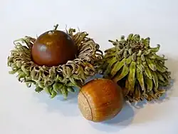 The flowers are wind-pollinated catkins. The fruit is an acorn, maturing about 18 months after pollination, 2–3 cm (3⁄4–1+1⁄4 in) long and 2 cm broad, bi-coloured with an orange basal half grading to a green-brown tip; the acorn cap is 1.5–2 cm (5⁄8–3⁄4 in) deep, densely covered in soft 4–8 millimetres (3⁄16–5⁄16 in) long 'mossy' bristles. It is closely related to Quercus cerris, classified with it in Quercus sect. Cerris, a section of the genus characterized by shoot buds surrounded by soft bristles, bristle-tipped leaf lobes, and acorns that mature in about 18 months.[3]