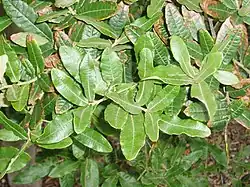 It is a tree up to 17 metres (56 feet) tall with a trunk as much as 100 centimetres (39 inches) in diameter. The leaves are thick and leathery, up to 10.8 centimetres (4+1⁄4 in) long, elliptical with wavy edges no teeth or lobes.[3][5][6]