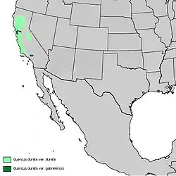 The range of Quercus durata stretches from Shasta County in Northern California to the bottom of the South Coast Range in Santa Barbara County. The most common variant is found in foothill woodlands and chaparral ecosystems at elevations between 30 and 1,570 m (100 to 5,150 ft).[3] It is especially abundant in Sargent cypress (Hesperocyparis sargentii) woodlands which can be found in portions of Mendocino, Sonoma, San Mateo, Santa Clara, Monterey, San Benito, San Luis Obispo and Santa Barbara counties as well as the San Francisco Bay region.[5] In more sheltered, inland areas like MacNab cypress (Hesperocyparis macnabiana) woodlands this shrub can extend into riparian zones where summer fogs persist.[11]