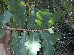 Quercus estremadurensis is a mostly deciduous tree (when mature rarely marcescent or semievergreen) within the roburoid[4] quercus subsection (that also comprises Quercus robur, Quercus petraea, Quercus hartwissiana and Quercus canariensis) thus sharing a good number of features with its closest relative Quercus robur such as bearing shortly petiolate broad and glabrous auriculated leaves, and long peduncled acorns. Also features close resemblance to other members of that subsection as happens with young tomentose sprouts and branches and fairly well elongated leaves brandishing high number of shallow lobes such as we can find in Quercus canariensis or Quercus hartwissiana.