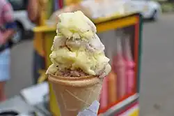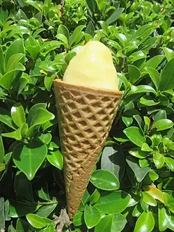 Queso ice cream, also called keso ice cream or cheese ice cream, is a Filipino ice cream flavor prepared using cheddar cheese. It is one of the most common ice cream flavors of the traditional sorbetes ice cream (usually dyed bright yellow), and is commonly served with scoops of ube, vanilla, and chocolate ice cream in one cone.[1][2][3][4][5] The classic dessert has a salty-sweet, tangy and savory flavor which blends sweet cream and orange bits of cheese.[6]