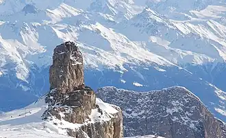 The Quille du Diable (lit. "devil's skittle"; also known as Tour St-Martin) is a peak of the Diablerets massif, located on the border of the municipalities of Conthey and Savièse in the canton of Valais. It lies on the edge of the high Tsanfleuron Glacier plateau and overlooks the valley around of Derborence 1,500 metres (4,900 ft) lower.