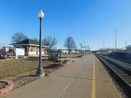 Quincy station is an Amtrak intercity train station in Quincy, Illinois, United States. The station is one of the namesake stations of the Chicago, Burlington and Quincy Railroad (CB&Q or Burlington Route), but today serves as the western terminus of Amtrak's Illinois Zephyr and Carl Sandburg trains. It was built in 1985 and was modeled after a former streetcar station of the early 20th Century.[2] Previously, the Illinois Zephyr crossed the Mississippi River and terminated at the former CB&Q station in West Quincy, Missouri after stopping in Quincy; indeed, the Quincy station was built due to West Quincy being frequently cut off by flooding. The decision to build a station on the Illinois side proved to be prescient when the Great Flood of 1993 destroyed the West Quincy station.