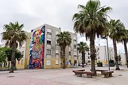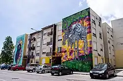 The Quinta do Mocho social housing project, consisting of four-story buildings, was built in the 1990s to house 3,000 people, mostly from former Portuguese colonies in Africa—Cape Verde, Guinea and Angola.[5] Social exclusion, high unemployment and poor housing standards contributed to the area having high crime rates and various social problems.[4] In order to improve the district's image, in 2014 local officials invited Portuguese and foreign artists to paint murals on its buildings.[6] The municipality has since stopped organising the project, however residents now maintain it and offer guided tours to visitors.[4] According to local officials, since the murals were painted, a bus line now serves the area, cultural events have multiplied, and the crime rate has fallen.[5][7]