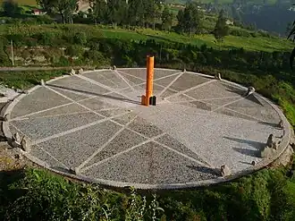 The Quitsato Sundial is a cultural-tourist place located at La Mitad Del Mundo, near to Cayambe, 47 km north of Quito, Ecuador. It was built in 2006 and inaugurated in 2007 as an independent, non-profit project in a 24,756 ft2 (2,300 m2) area. Its main goal is to share crucial aspects of the astronomical knowledge of the prehispanic cultures of the region. The expositions are carried out by community members as a self-sustaining project.
