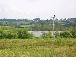 Quoisley Meres lie on the Cheshire Plain, near the boundary with Shropshire, at an average elevation of around 75 metres.[1] In common with the majority of meres in the Meres and Mosses natural area, they probably represent glacial kettle holes, formed at the end of the last ice age, some ten or fifteen thousand years ago.[2][3][4] The meres are located immediately south of the track from Wirswall Road to Mere Farm, around ¾ mile west of the village of Marbury; the nearest town is Whitchurch, around 2½ miles to the south. There are two meres; the larger, Quoisley Big Mere, is at SJ546455, and the smaller, Quoisley Little Mere, at SJ549455. A narrow strip of woodland, Holly Rough, lines the farm track immediately to the north of Little Mere.[1] The catchment area of the meres is 136 hectares (340 acres).[5]