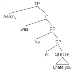 Standard North American English Glasgow English Dutch[41] [TP Aaron [T' was [PP like [DP ∅ [QUOTE I hate you]]]]] [TP Aaron [T' was [PP like [DP ∅ [QUOTE I hate you]]]]] [TP Ik [T' hebben [DP zoiets [PP van [DP ∅ [QUOTE I hate you]]]]] *[TP Aaron [T' was [PP like [DP that [QUOTE I hate you]]]]] [TP Aaron [T' was [PP like [DP that [QUOTE I hate you]]]]] *[TP Ik [T' hebben [DP ∅ [PP van [DP ∅ [QUOTE I hate you]]]]]