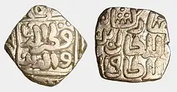 ![]() Gold square tanka of Qutb al-Din Mubarark, minted in Delhi, AH 718 (1318/19 CE). | |||||