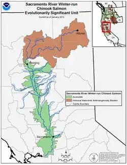 - ^ "Ecosystem Restoration: Winter-Run Chinook Salmon in the Sacramento River" (PDF). CALFED Bay-Delta Program. Archived (PDF) from the original on September 6, 2010. Retrieved August 29, 2010.