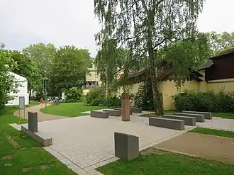 Today, the site of the synagogue is marked with a memorial by sculptor Christof Krause, erected in 1979. An extension was added in 2015, with a row of paving stones indicating the outline of the synagogue and 8 stone blocks indicating the rows of seats. A stone with the relief of a menorah marks the site of the former Torah shrine.[4] In addition, there are a number of Stolpersteine (stumbling stones) in Rödelheim commemorating the lives of Jews and others persecuted under National Socialist rule.