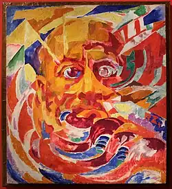 Inspired by Giacomo Balla's artistic use of movement and speed, Růžena Zátková's works are considered pioneering examples of kinetic art.[1] Her works have been described as lacking "shyness" and possessing a "fiery" sense of momentum.[1] Zátková was also inspired by Primitivism, and her works often include motifs stemming from the folk art traditions of her homeland. Zátková was a close friend of the founders of Neo-Primitivism, Michail Larionov and Natalia Goncharova;[3] they first met in 1915, when Sergei Diaghilev invited them to stay with him and the Ballets Russes at a Swiss villa he had recently rented.[5] In 1916, when Zatkova was ill with tuberculosis, Goncharova dedicated two gouaches to her, which were both rediscovered in 2019.[5]