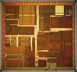 The R12000 was fabricated by NEC and Toshiba in a 0.25 μm CMOS process with four levels of aluminum interconnect. The use of a new process does not mean that the R12000 was a simple die shrink with a tweaked microarchitecture; the layout of the die is optimized to take advantage of the 0.25 μm process.[7][8] The NEC fabricated VR12000 contained 7.15 million transistors and measured 15.7 by 14.6 mm (229.22 mm2).