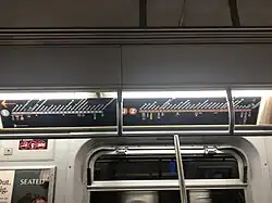 Unlike the rest of the NTT fleet at the time, the R143s are equipped with interior LED screens, which take the place of the MTA Arts for Transit cards that are usually located there. These screens can display advertisements, public safety announcements, and other information.[10] Several cars of the NTT fleet were similarly retrofitted with LCD screens after they were delivered, and all subsequent orders are built with these screens. However, the LCD screens have the capability to display multiple colors instead of only red, orange, and green.