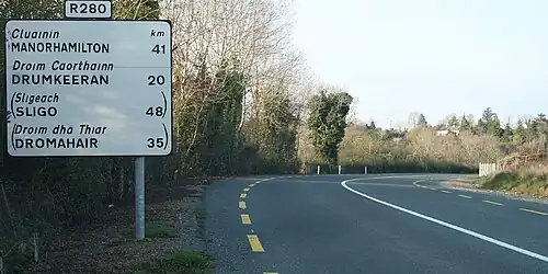 The R280 road is a regional road in Ireland linking Bundoran in County Donegal in the north to Carrick-on-Shannon in County Leitrim. En route it passes through Kinlough, Manorhamilton, Drumkeeran and Leitrim village. The road is 74 km (46 mi) long.[1]