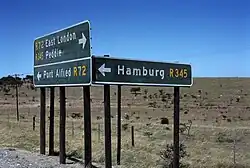 The R345 is a Regional Route in South Africa that connects the R72 near Bell in the Ngqushwa Local Municipality with Cathcart passing through Peddie, the Great Fish River Nature Reserve, Alice and Hogsback. It is co-signed with the R63 between Alice and Fort Hare.[2] In the eighties, the route started in Hamburg;[3] however, this section is no longer part of the R345 by 2012.[2]