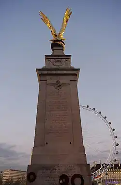 The Royal Air Force Memorial is a military memorial on the Victoria Embankment in central London, dedicated to the memory of the casualties of the Royal Air Force in World War I (and, by extension, all subsequent conflicts). Unveiled in 1923, it became a Grade II listed structure in 1958, and was upgraded to Grade II* in 2018. It is considered to be the official memorial of the RAF and related services.