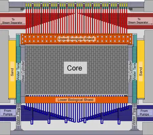 The reactor vessel has on its outer side an integral cylindrical annular water tank,[17] a welded structure with 3 cm thick walls, an inner diameter of 16.6 m and an outer diameter of 19 m, internally divided to 16 vertical compartments. The water is supplied to the compartments from the bottom and removed from the top; the water can be used for emergency reactor cooling. The tank contains thermocouples for sensing the water temperature and ion chambers for monitoring the reactor power.[18] The tank, along with an annular sand layer between the outer side of the tank and inner side of the pit,[14] and the relatively thick concrete of the reactor pit serve as lateral biological shields.