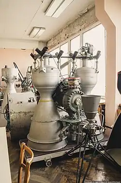 The RD-250 (Russian: Ракетный Двигатель-250, romanized: Raketnyy Dvigatel-250, lit. 'Rocket Engine 250', GRAU index: 8D518) is the base version of a dual-nozzle family of liquid-fuel rocket engines, burning a hypergolic mixture of unsymmetrical dimethylhydrazine (UDMH) fuel with dinitrogen tetroxide (N2O4) oxidizer in a gas-generator open cycle.[7] The RD-250 was developed by OKB-456 for Yangel's PA Yuzhmash ICBM, the R-36 (8K67). Its variations were also used on the Tsyklon-2 and Tsyklon-3 launch vehicles. It was supposed to be used on the Tsyklon-4, but since the cancellation of the project it should be considered as out of production.
