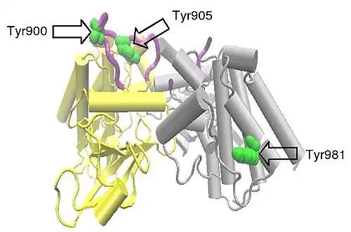 Phosphorylation of Tyr981 and the additional tyrosines Tyr1015, Tyr1062 and Tyr1096, not covered by the above structure, have been shown to be important to the initiation of intracellular signal transduction processes.