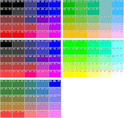 Initially, the limited color depth of most video hardware led to a limited color palette of 216 RGB colors, defined by the Netscape Color Cube. The web-safe color palette consists of the 216 (63) combinations of red, green, and blue where each color can take one of six values (in hexadecimal): #00, #33, #66, #99, #CC or #FF (based on the 0 to 255 range for each value discussed above). These hexadecimal values = 0, 51, 102, 153, 204, 255 in decimal, which = 0%, 20%, 40%, 60%, 80%, 100% in terms of intensity. This seems fine for splitting up 216 colors into a cube of dimension 6. However, lacking gamma correction, the perceived intensity on a standard 2.5 gamma CRT / LCD is only: 0%, 2%, 10%, 28%, 57%, 100%. See the actual web safe color palette for a visual confirmation that the majority of the colors produced are very dark.[22]