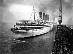 In September 1909, Mauretania captured the Blue Riband for the fastest westbound crossing—a record that was to stand for more than two decades.[2] In December 1911, as in New York City in December 1910, Mauretania broke loose from her moorings while in the River Mersey and sustained damage that caused the cancellation of her special speedy Christmas voyage to New York. In a quick change of events Cunard rescheduled Mauretania's voyage for Lusitania, which had just returned from New York, under the command of Captain James Charles. Lusitania completed Christmas crossings for Mauretania,[27] carrying travellers back to New York. Mauretania was on a westbound voyage from Liverpool to New York, beginning 13 April 1912, and was docked at Queenstown, Ireland, at the time of the RMS Titanic disaster. Mauretania was transporting Titanic's cargo manifest carried by registered mail. Traveling on Mauretania at the time was the chairman of Cunard, A. A. Booth, who organised a vigil for the Titanic victims.[28]