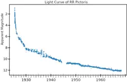 At the time of its discovery, RR Pictoris had an apparent magnitude of 2.3. It continued to brighten to magnitude 1.2, which it reached on 9 June 1925. It dimmed to magnitude 4 by 4 July, but brightened again to 1.9 on 9 August. Six months after its peak brightness, RR Pictoris faded to be invisible to the unaided eye, and was magnitude 12.5 by 1975.[6] RR Pictoris is classified as a slow nova[7] and its light curve exhibits positive superhumps, meaning superhumps with a period a few percent (8.6% in this case) longer than the star system's orbital period.[8]